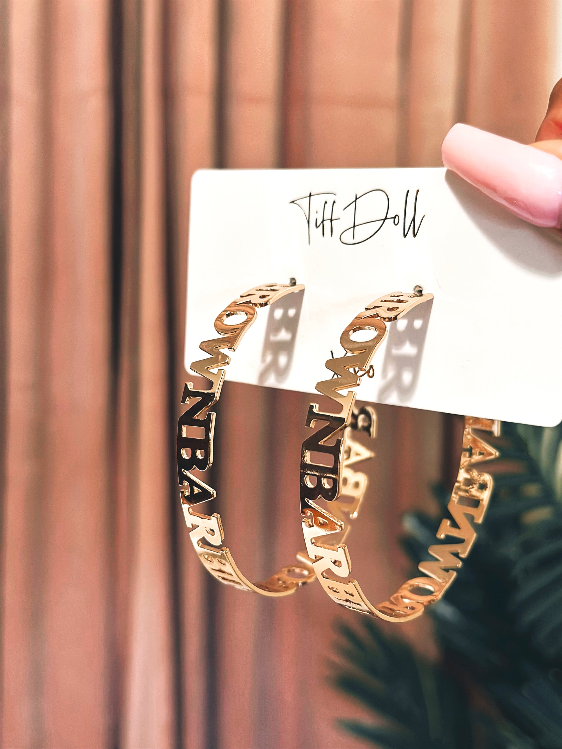 These hoops are for the unapologetic Barbz!! Very pretty, essential everyday hoops with Brown Barbie text circling the earring.