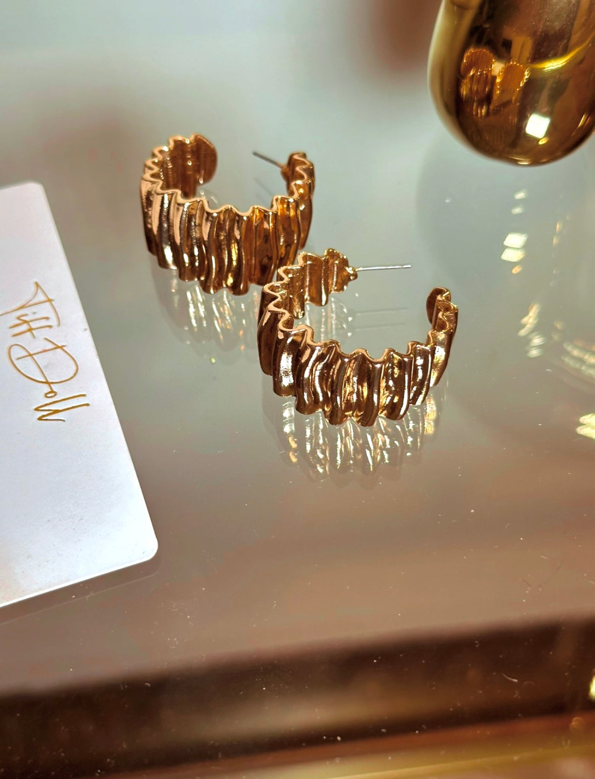 Introducing our fab gold ribbed earrings, the ultimate go-to accessory for both work and play! With their trendy ribbed design and shiny gold finish, these earrings add a pop of fun and flair to any outfit. Whether you're rocking them at the office or out for dinner with friends, you'll be turning heads and making a statement wherever you go. Amp up your style with these playful and versatile earrings.