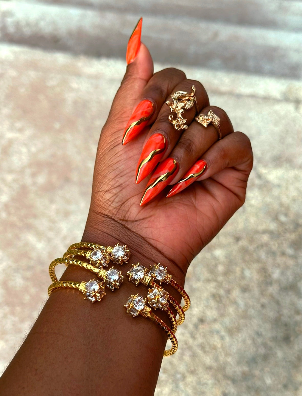Be the star of the show with these rich gold and icy bangles! Can be worn to a dinner date or to the office; super versatile.