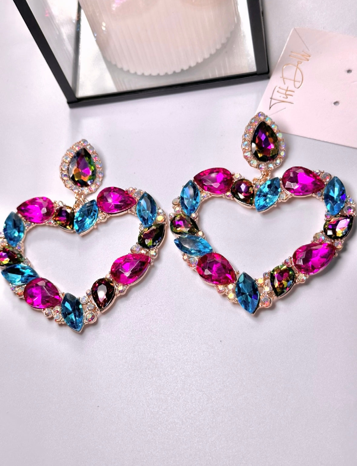 Super Flashy! Multi-colored Crystal Diamante’ stones are drenched over these heart shaped earrings. Perfect for brunch or vacation.
